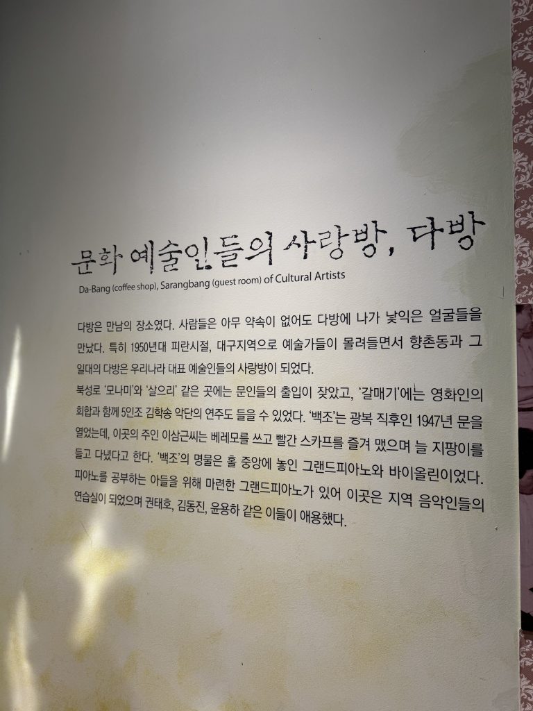 その後、香村洞は1970年代まで、大邱の中心、いわゆる“市内”とよばれた最高の繁華街であり商業地域だった。有名な喫茶店、マッコリ屋、音楽鑑賞室などの名所が位置しており、大邱で最も多くの人が集まる場所だった。